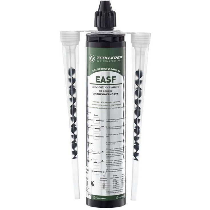 Химический анкер для высоких нагрузок TECH-KREP EASF предназначен для анкерных креплений в тяжелом и легком бетоне, железобетоне и природном камне. Используется для крепления арматуры, кронштейнов, строительных конструкций, лестниц, дверных и оконных коробок, складского оборудования, систем трубопроводов и вентиляции и т.д. Также подходит для заполнения трещин, в качестве ремонтного и связующего состава для железобетонных конструкций.