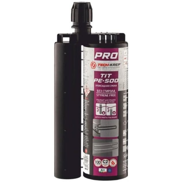 Химический анкер TIT PE-500 представляет собой двухкомпонентный состав на основе эпоксидной смолы, представлен в инъекционном картридже с разделенной емкостью для отвердителя. Подходит для высоких и сверхвысоких нагрузок. Не содержит стирол и не имеет запаха, благодаря чему анкер допускается использовать в помещениях. Обладает пониженной вязкостью, что позволяет заполнять отверстия, не оставляя пустот и обеспечивая наилучшую адгезию с основанием. При увеличении глубины установки несущая способность химического анкера увеличивается. Анкер используется совместно с резьбовыми шпильками, фундаментными болтами, арматурными прутками и т.п.