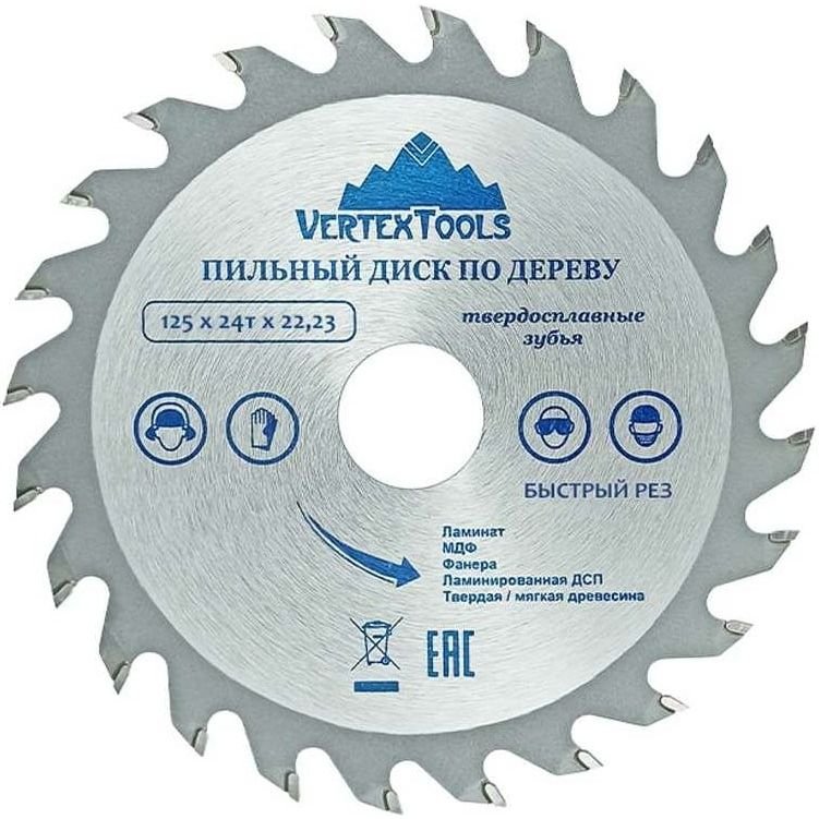 Пильный диск по дереву Vertextools с победитовыми напайками. Диск предназначен для выполнения точных продольных и поперечных чистовых пропилов в мягкой и твердой древесине, прессованной слоистой древесине, фанере, ламинате и ДСП. Напаянные индуктивным способом твердосплавные переменные зубья с агрессивным углом резания обеспечивают одновременно быстрое и точное пиление. Чистота распила зависит от количество зубьев и расстояния между ними. Чем больше зубья, тем чище распил. Основа выполнена из углеродистой стали, напайки на зубах из карбидно-вольфрамового сплава (победита).